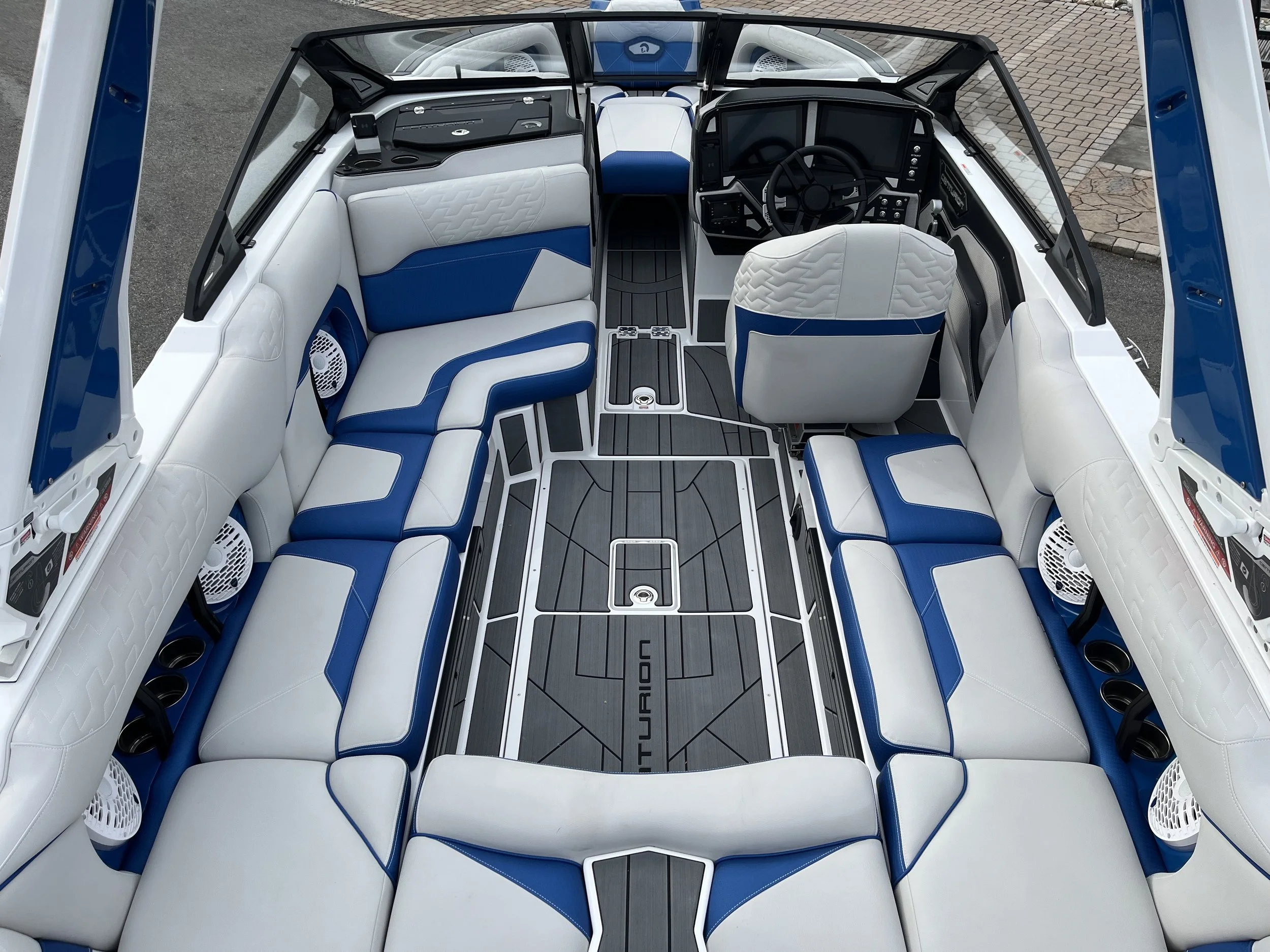 In stock and available now! This beautiful 2025 Centurion Fe23 is optioned in Steel Blue Metaflake , with a gorgeous whisper gray interior. Configured with every available ballast option, this Fe23 boasts over 5250lbs of ballast and throws an absolutely incredible wave. Additional features include quicksurf, wet sounds audio package with Rev 10 tower speakers, 8" in boats, subwoofer and optional helm control, led light rings, heater package with heated seat and wind dam, bow filler cushion, sewlong bimini, board racks, and much more.